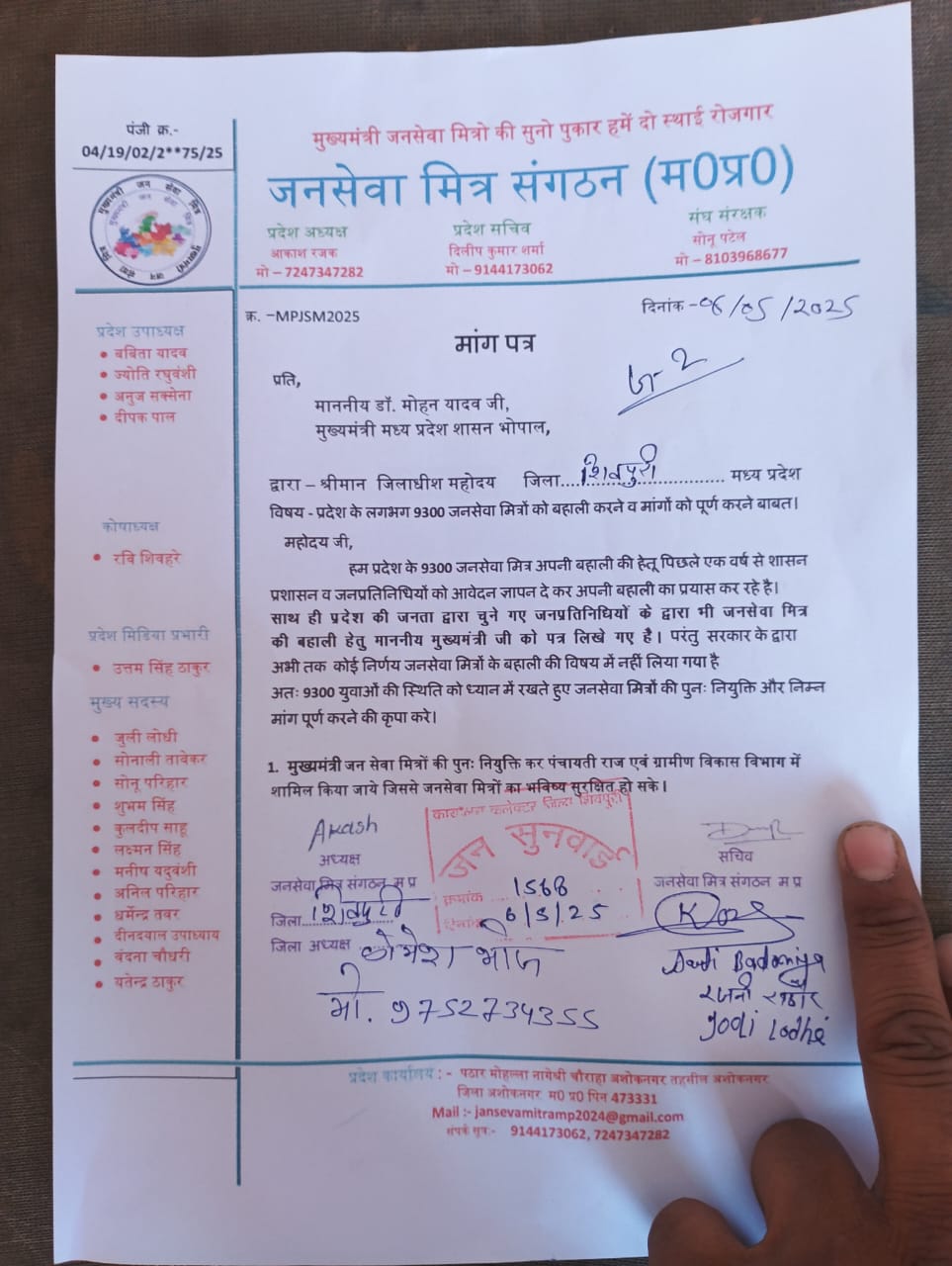 मध्यप्रदेश के 50 से अधिक जिला स्तर पर जनसेवा मित्रों की बहाली की मांग को लेकर 9 हजार 300 युवाओं ने मुख्यमंत्री के नाम दिया ज्ञापन